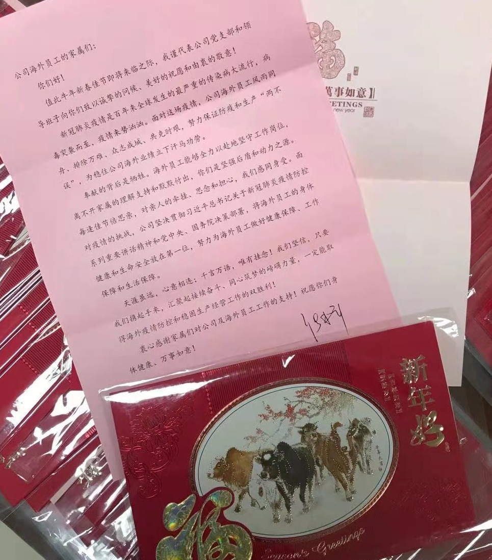 走訪過程中,金總還向家屬及離退休老同志簡要介紹了公司全年的情況。新冠肺炎疫情是百年來全球發(fā)生的最嚴(yán)重的傳染病大流行,面對這場疫情,公司海內(nèi)外員工風(fēng)雨同舟、共克時艱,努力保證防疫和生產(chǎn)“兩不誤”,為穩(wěn)住公司業(yè)績立下汗馬功勞。過去一年取得難能可貴的成績,離不開海外員工家屬及離退休老同志的理解支持和默默付出。公司衷心感謝他們長期以來為公司發(fā)展所作的貢獻(xiàn)、關(guān)心和支持,祝愿他們新春快樂、身體健康、闔家幸福、萬事如意!